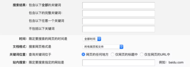 百度的高級(jí)檢索,可以限定關(guān)鍵詞,限定要搜索的網(wǎng)頁的時(shí)間,限定文檔格式等。