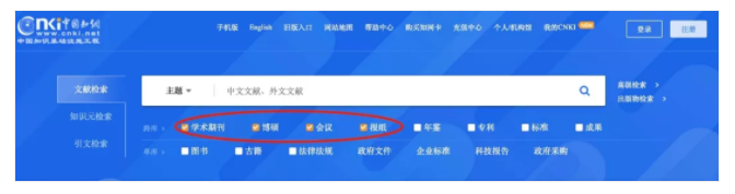 第一步:將搜索框下方默認(rèn)的博碩、會(huì)議、報(bào)紙這幾個(gè)檢索范圍去掉,只保留學(xué)術(shù)期。