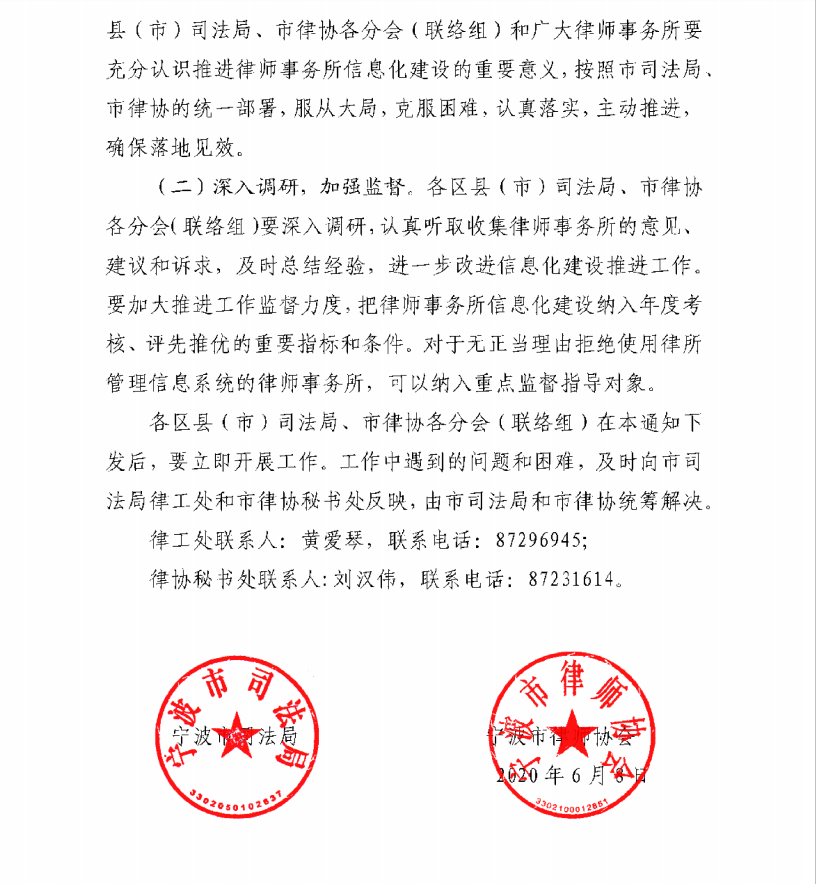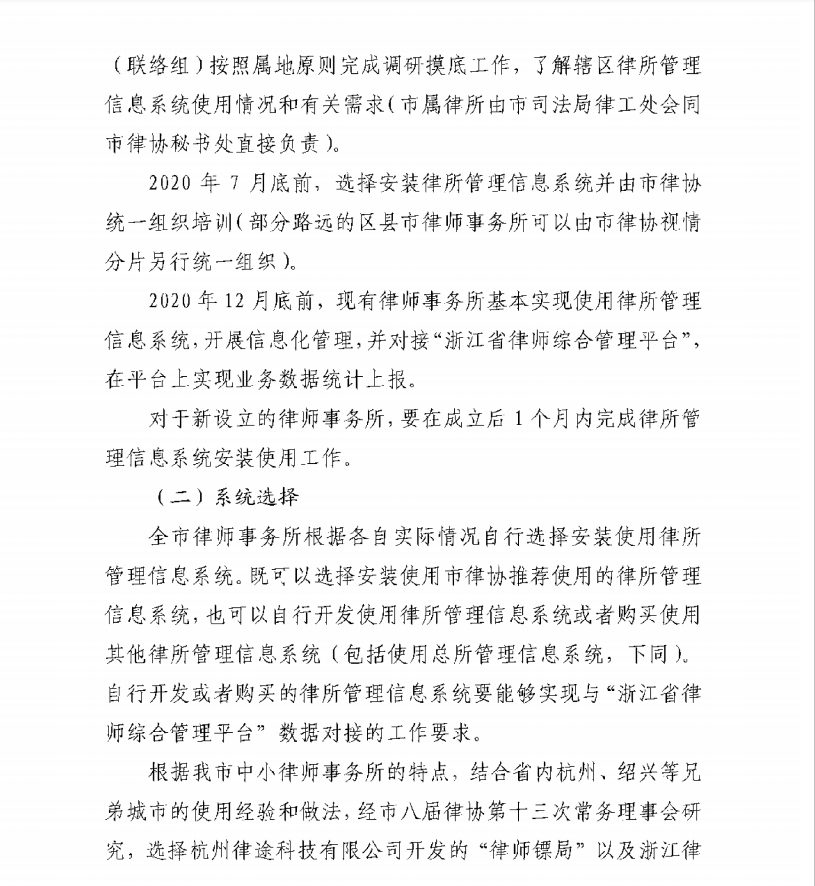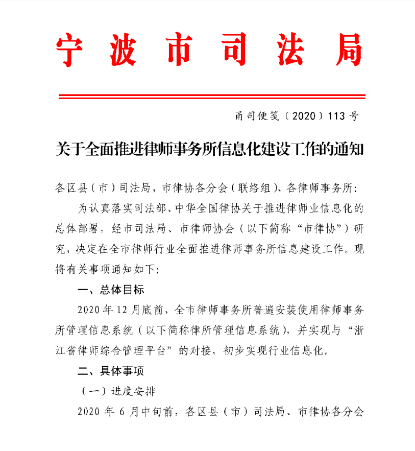 根據寧波市司法局關于全面推進律師事務所信息化建設工作的通知,目標將于2020年12月底前,實現寧波全市律師事務所普遍安裝并使用律師事務所管理信息系統,并實現與“浙江省律師綜合管理平臺”的對接,初步實現行業信息化。