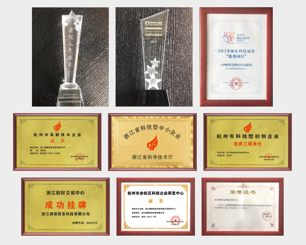 榮獲GLH2019第二屆全球法律科技黑客松大賽武漢賽區“法律科技創新獎”和“最佳人氣項目獎”;榮獲2019中國國際大數據博覽會“優秀項目”獎項;榮獲2019全國政法智能化建設智慧司法優秀解決方案獎;軟件著作權共19項。