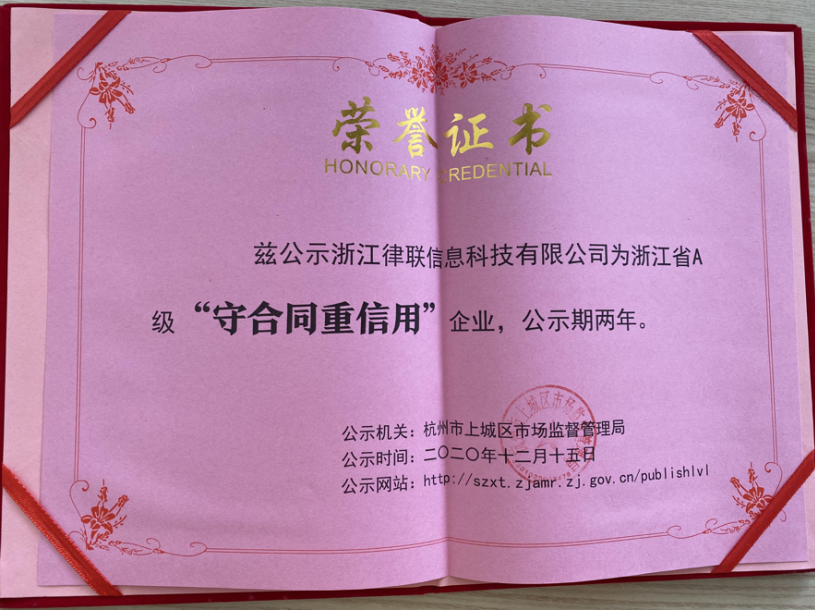 2020年12月,浙江律聯信息科技有限公司憑借多年的誠信經營和規范管理,通過杭州市市場監督管理局的嚴格評審,榮獲浙江省A級“守合同重信用企業”的稱號。